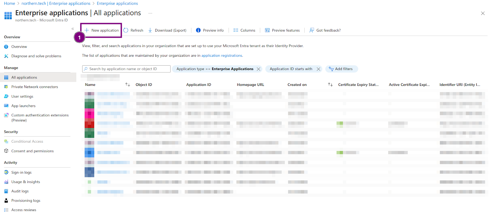 Under Microsoft Entra ID, select the creation of a new application. (1)