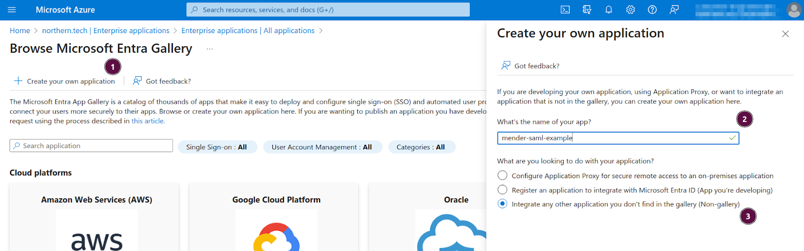 This example will show you how to set Microsoft Entra ID as an Identity Provider (IdP) for hosted Mender as a Service Provider (SP).