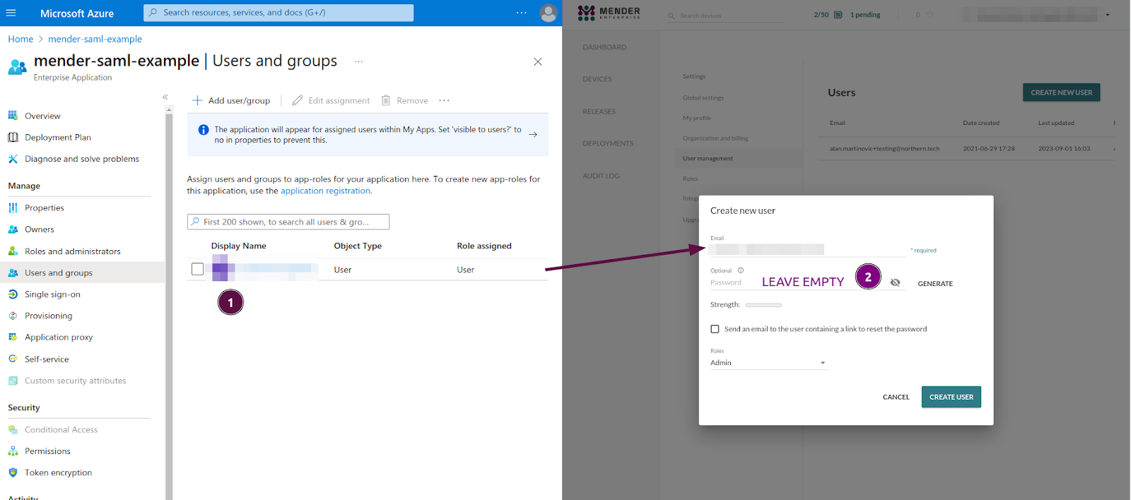 In Mender, create a new user with the Email corresponding to the User principal name set in Azure Entra ID.